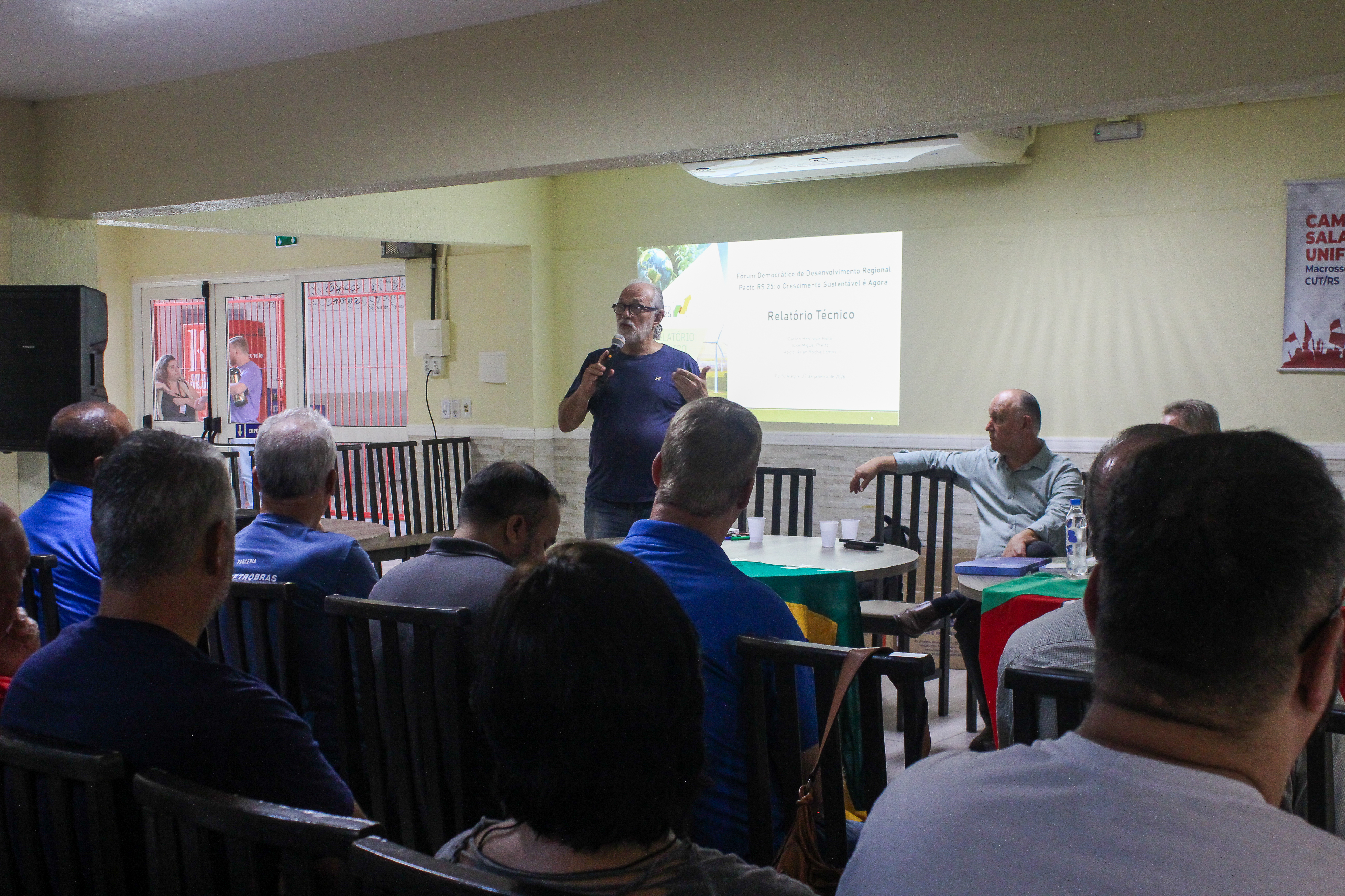 Na abertura da atividade, foi apresentado o Relatório Técnico do Fórum Democrático de Desenvolvimento Regional Pacto RS 25: o Crescimento Sustentável é agora, com o deputado estadual Pepe Vargas (PT) e coordenador do Fórum, Ronaldo Zulke. O documento traz um retrato das crises enfrentadas pelo estado: econômica, demográfica e climática e os desdobramentos disso na vida da sociedade gaúcha. Após, houve a entrega do Relatório para os sindicatos presentes.