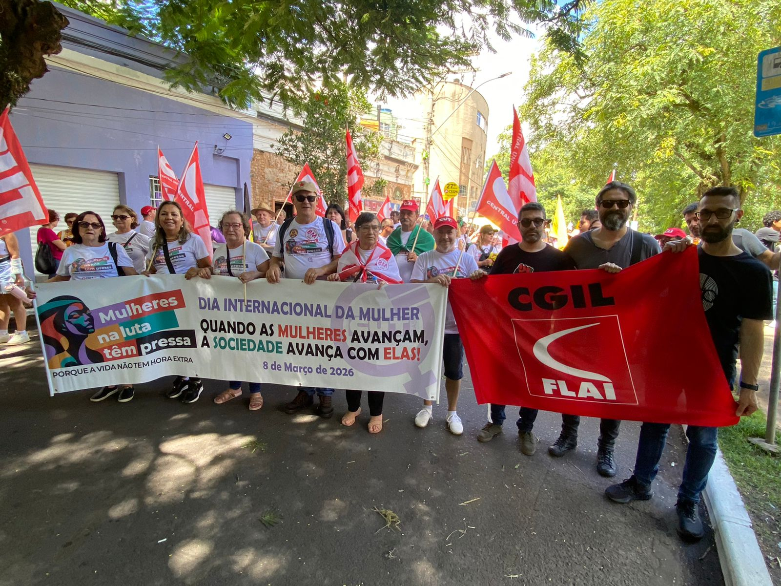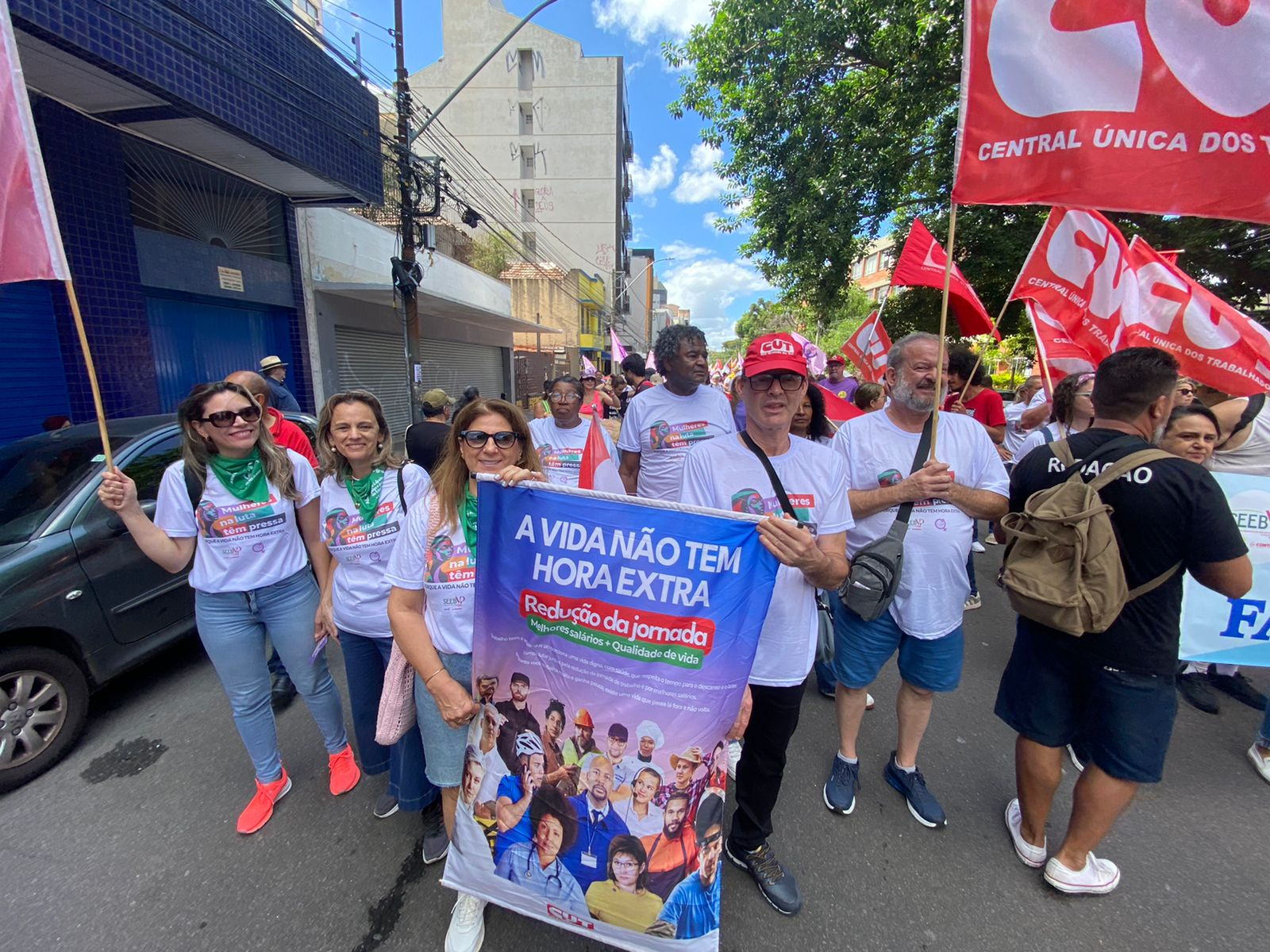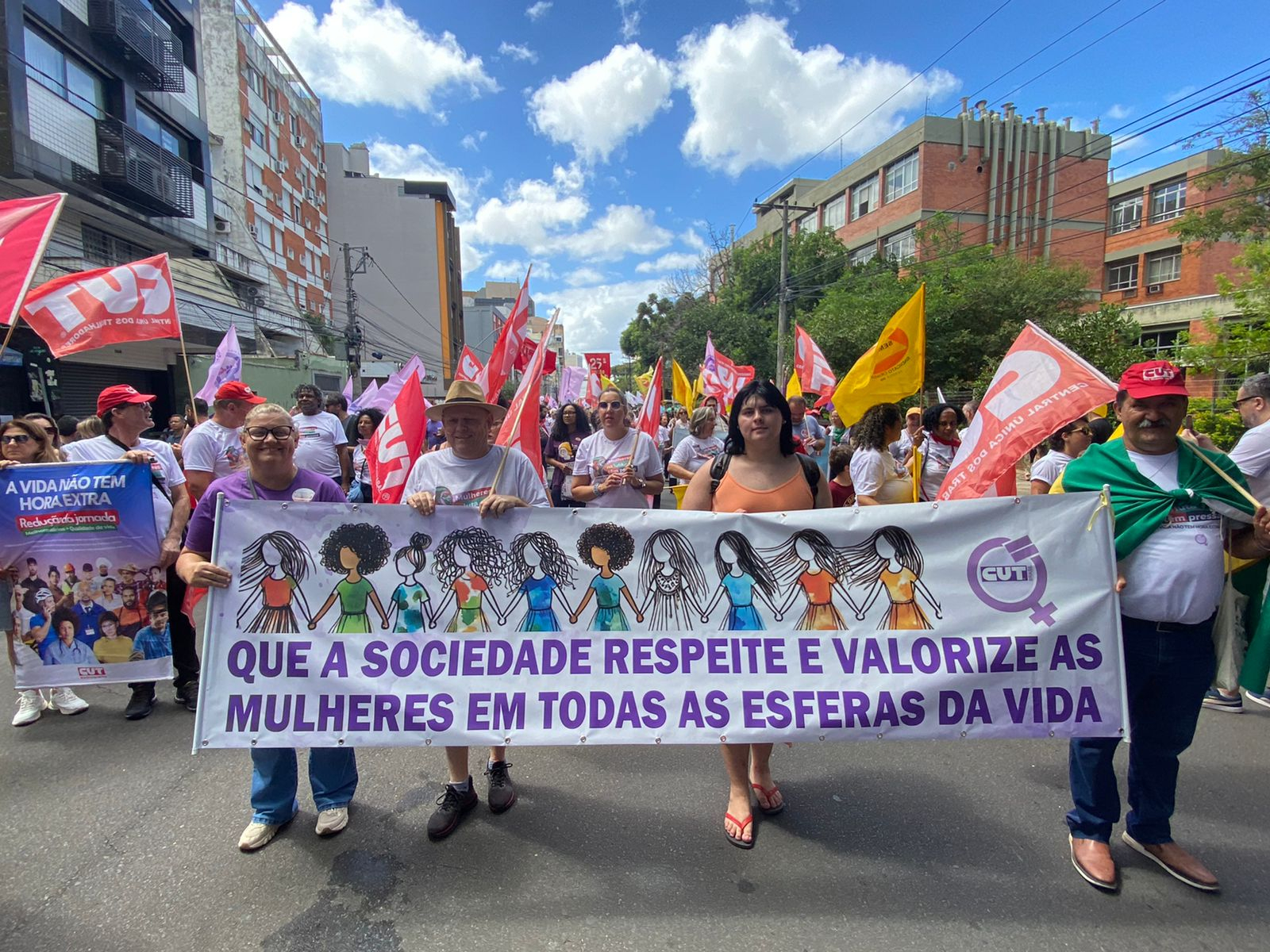 Com faixas e cartazes, as manifestantes denunciaram o feminicídio, a precarização do trabalho e as desigualdades no mercado de trabalho, além de defender pautas como dignidade menstrual, soberania, ampliação de políticas públicas para as mulheres e o fim da escala 6×1.
